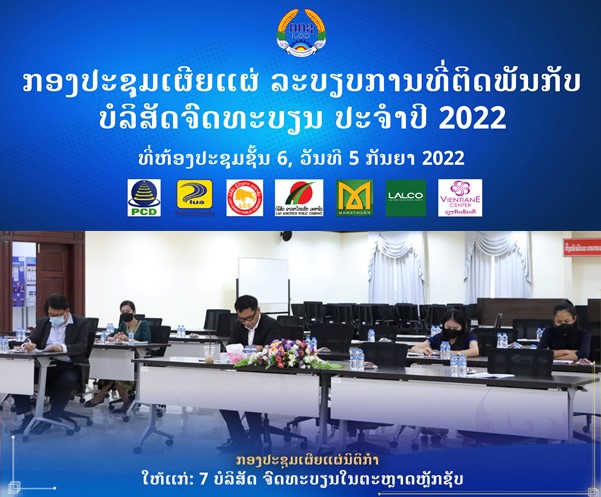ໃນຕອນບ່າຍຂອງວັນທີ 5 ກັນຍາ 2022 ທີ່ ຫ້ອງປະຊຸມໃຫຍ່ ສໍານັກງານຄະນະກໍາມະການຄຸ້ມຄອງຫຼັກຊັບ, ສໍານັກງານຄະນະກຳມະການຄຸ້ມຄອງຫຼັກຊັບໄດ້ຈັດກອງປະຊຸມເຜີຍແຜ່ນິຕິກຳທີ່ຕິດພັນກັບວຽກງານຫຼັກຊັບໃຫ້ແກ່ ບໍລິສັດຈົດທະບຽນໃນຕະຫຼາດຫຼັກຊັບລາວ ຈຳນວນ 7 ແຫ່ງຂຶ້ນເຊິ່ງປະກອບມີ: ບໍລິສັດ ຊີມັງລາວ ມະຫາຊົນ, ບໍລິສັດ ປີໂ...