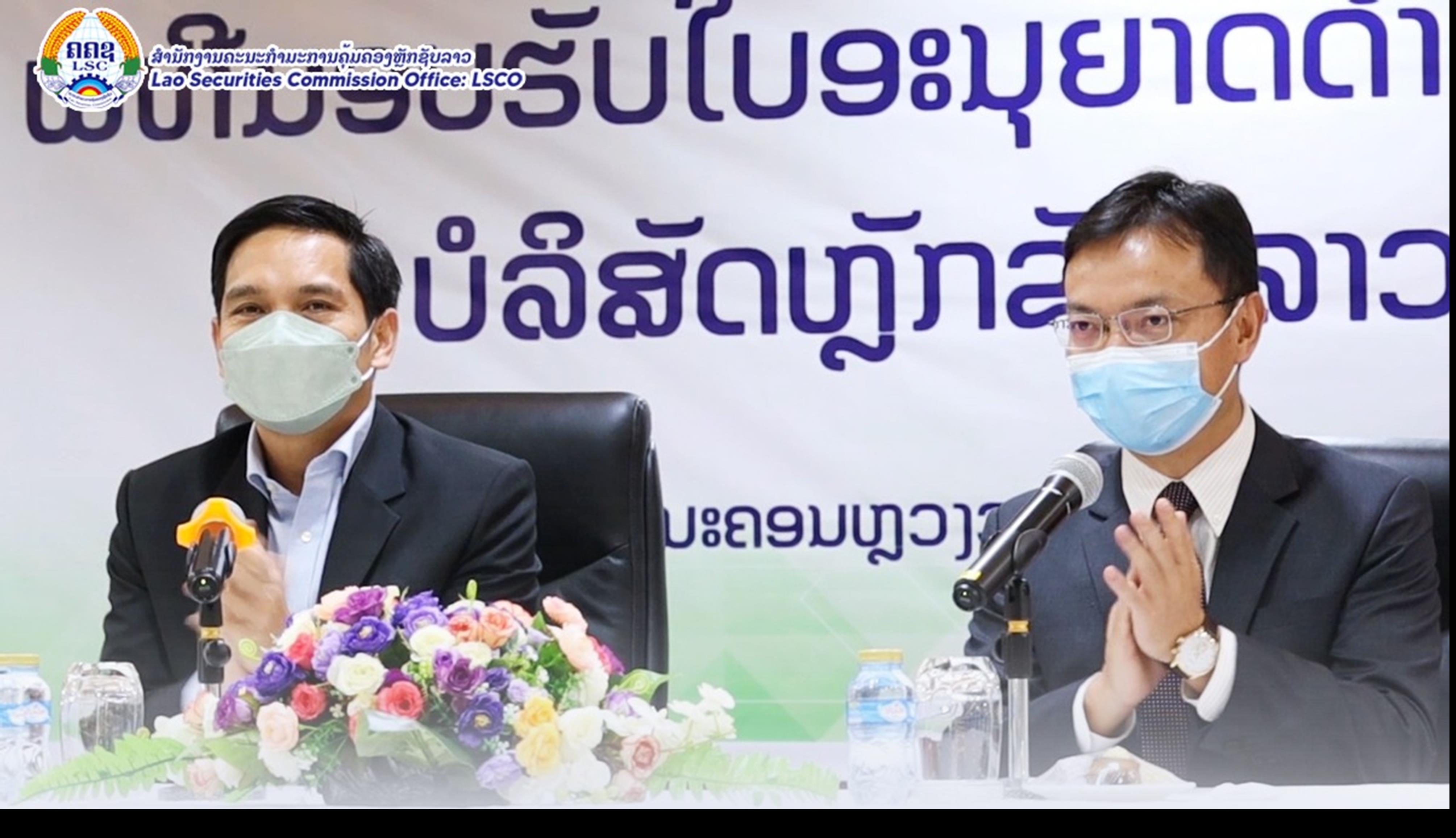 ໃນຕອນບ່າຍຂອງວັນທີ 14 ມັງກອນ 2022 ທີ່ ຫ້ອງປະຊຸມໃຫຍ່ ສໍານັກງານຄະນະກໍາມະການຄຸ້ມຄອງຫຼັກຊັບ ໄດ້ຈັດພິທີມອບຮັບໃບອະນຸຍາດດໍາເນີນທຸລະກິດຂອງ ບໍລິສັດຫຼັກຊັບ ລາວ-ຈີນ ຈຳກັດ ຂຶ້ນ, ໂດຍການເປັນປະທານຂອງ ທ່ານ ສຽວສະຫວາດ ທິລະກຸນ, ຮອງຫົວໜ້າ ສໍານັກງານຄະນະກໍາມະການຄຸ້ມຄອງຫຼັກຊັບ ແລະ ທ່ານ ລິນລີ, ຜູ້ອໍານວຍກາ...